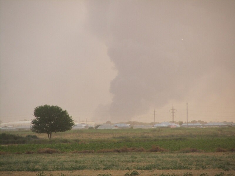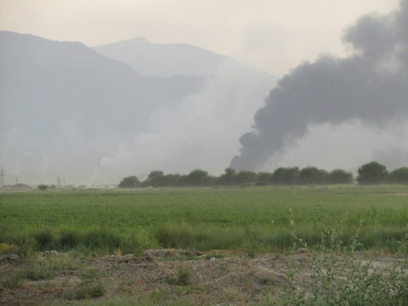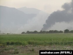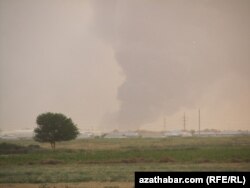 Partlamadan soň emele gelen tüsse, 7-nji iýul, Abadan şäheriniň golaýy. (Surata düşüren Azatlyk Radiosynyň habarçysy Myrat Gurbanow)