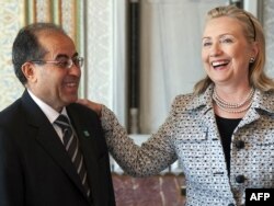 Birleşen Ştatlaryň Döwlet sekretary Hillari Klinton (sagda) we Liwiýanyň Milli geçiş geňeşiniň ýolbaşçysy Mahmud Jibril Stambuldaky duşuşykda, 15-nji iýul.