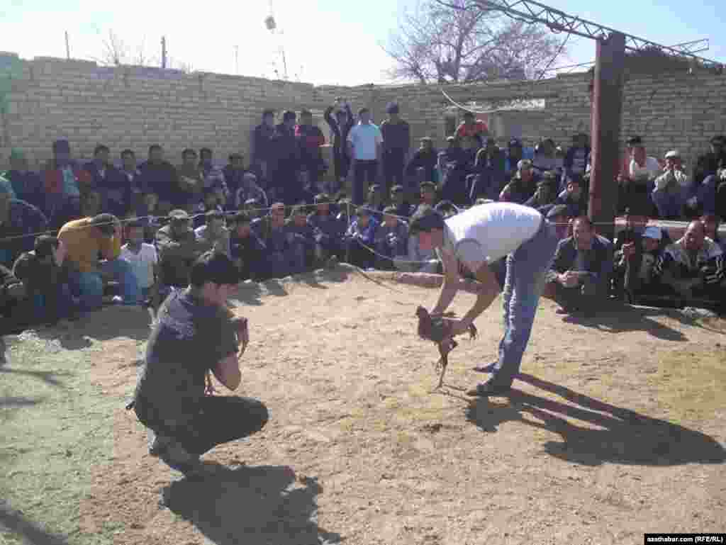 Türkmenistanyň Türkmenabat şäherinde her hepdäniň ýekşenbe güni horaz uruşdyrmaklyk ýerli däbe öwrülen. Bu bäsleşiklere her gezek azyndan 10-20 gatnaşdyrylýandygy we ol söweş horazlarynyň öz bahalarynyň 100-300 dollar aralygydygy aýdylýar. Bu suratlarda şol çäräniň geçiş pursatlaryny görmek bolýar. Türkmenabat, mart, 2013.