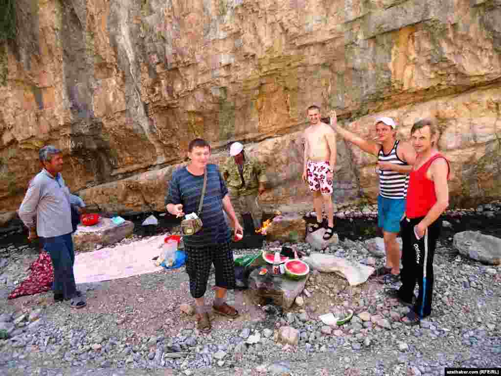 Köçäniň boýunda dag ösümliklerini satyp oturan ýerli adamlar
