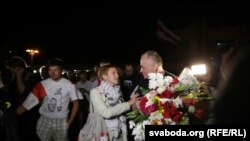 Ol onlarça dogan-garyndaşy we dostlary, oppozisiýa liderleri we beýleki goldawçylary tarapyndan Minskiniň gündogaryndaky demirýol stansiýasynda şowhun bilen garşy alyndy.